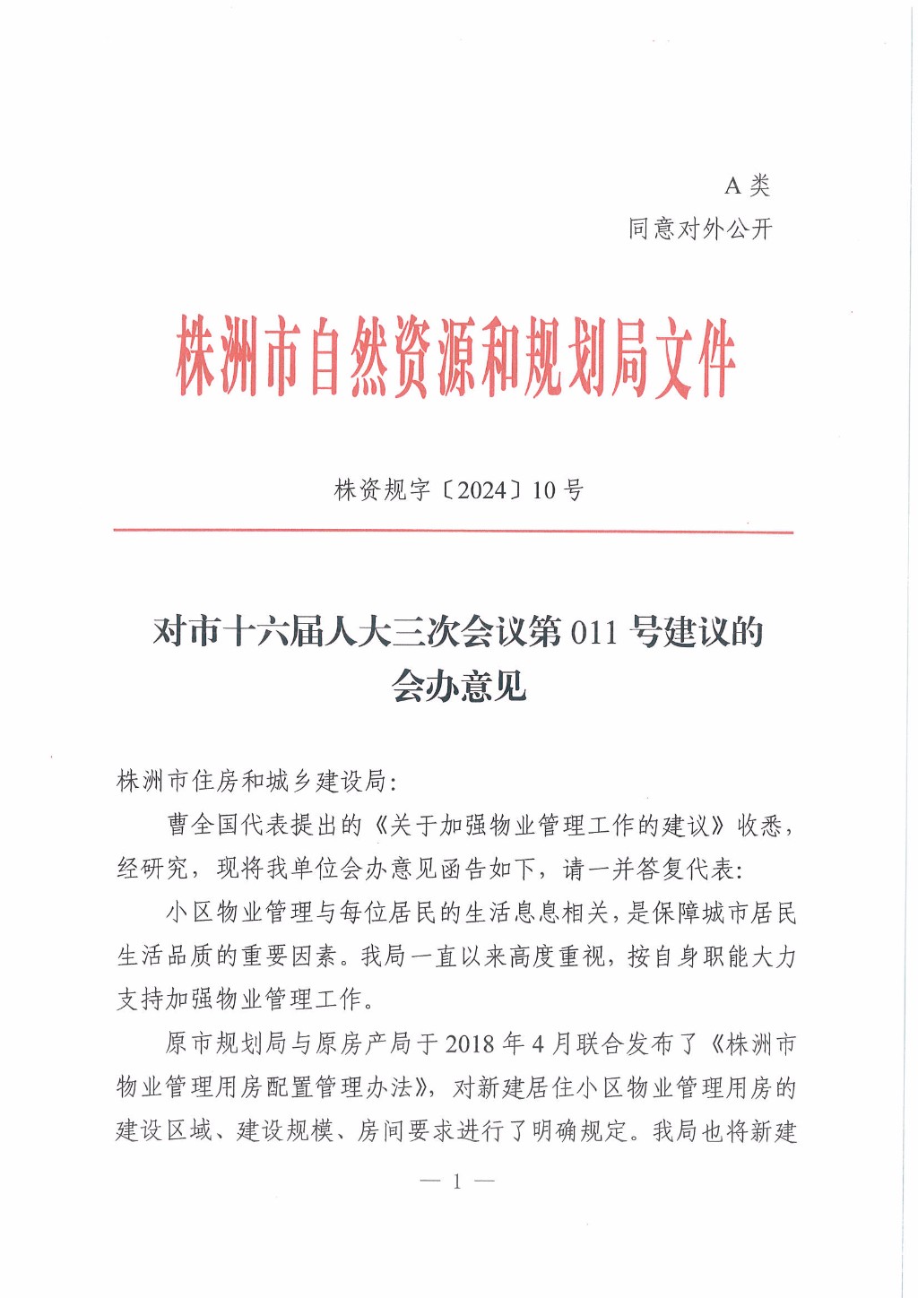 株资规字〔2024〕10号,对市十六届人大三次会议第011号建议的会办意见