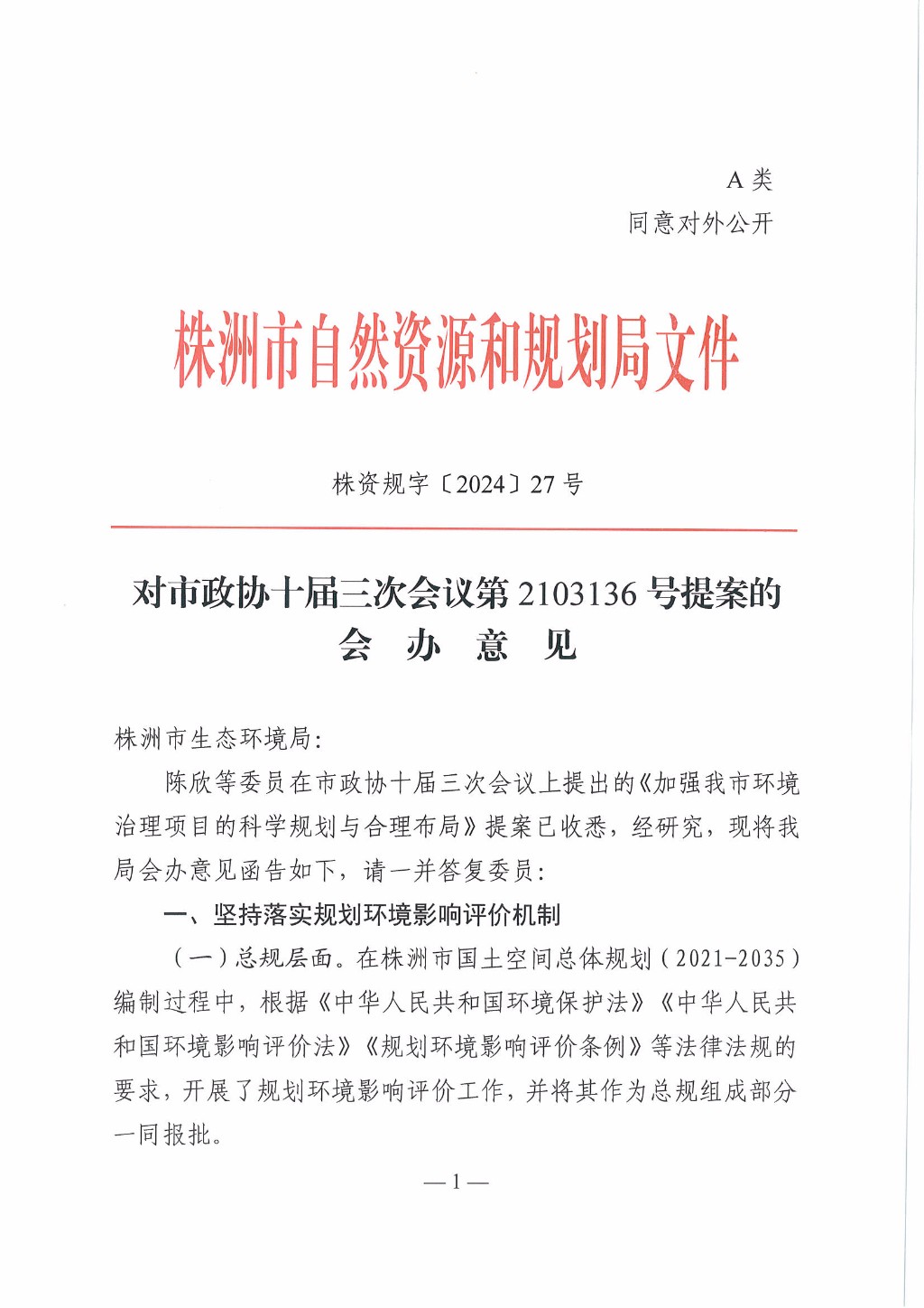 株资规字〔2024〕27号,对市政协十届三次会议第2103136号提案的会办意见
