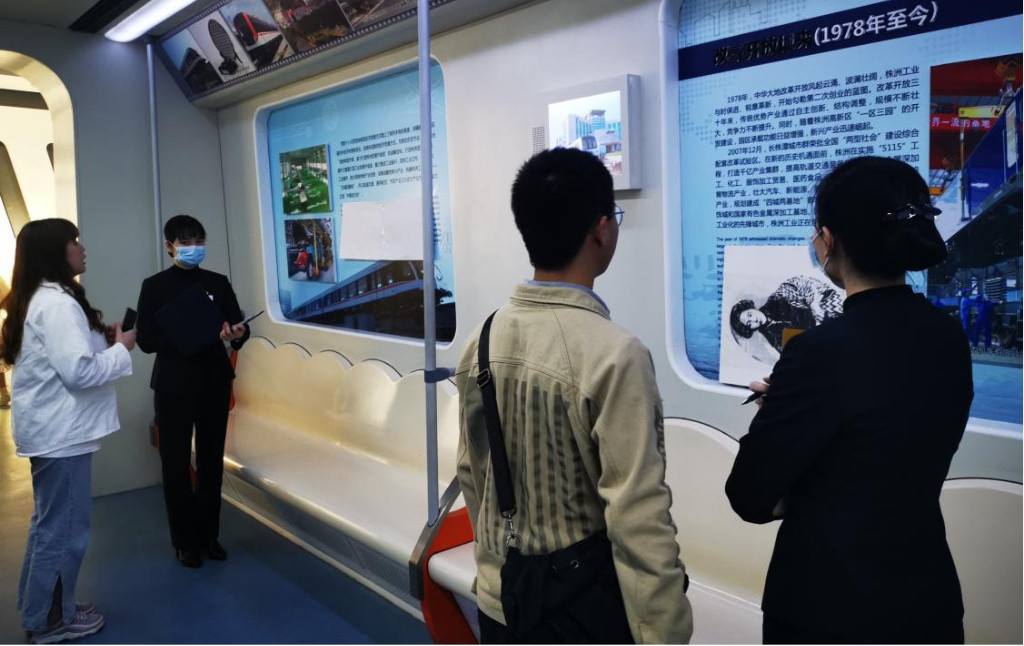 随后,在工业车厢里,同学们聚在一起,以分组的形式对改革开放以来株洲的工业发展情况进行了英文讲解。展厅里形成了别具一格的“英语角”。规划馆的讲解员们也在一旁认真聆听并耐心指导。