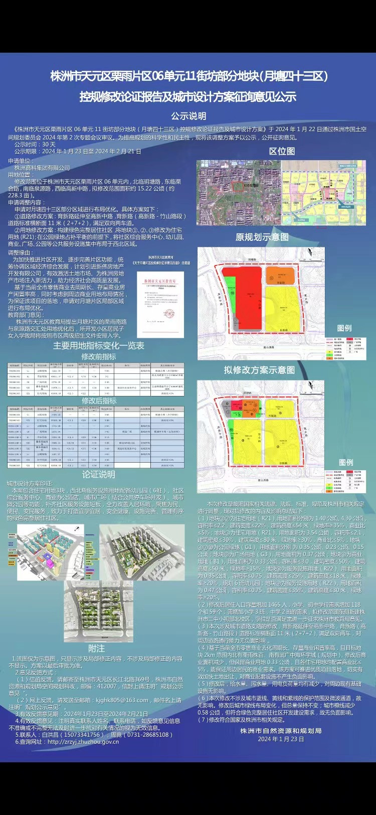 《株洲市天元区栗雨片区06单元11街坊部分地块(月塘四十三区)控规调整规划方案》事前意见征集公示