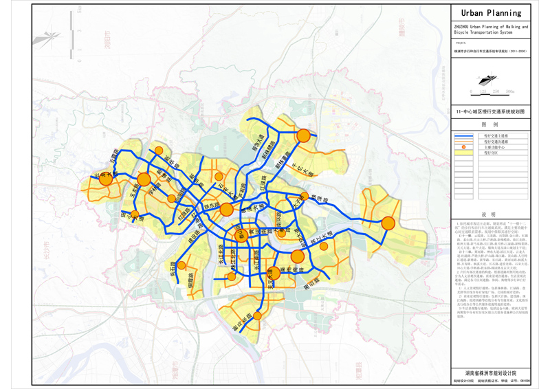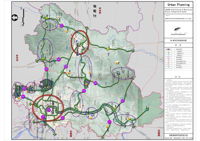 (1)规划理念 扬盖尔——慢速交通意味着有活力的城市,慢行回归,背后隐藏着生活理念绿色、自然、健康回归的思潮。城市内部推行稳静区,创造良好的慢行出行环境,郊区建设有机串联各类有价值的自然和人文资源,兼具生态、社会、经济、文化等多种功能的绿道,以解决生态环保问题和提高居民生活质量。 (2)规划目标及意义 坚持“资源节约型、环境友好型”的两型规划理念,体现“可持续发展”和“以人为本”,凸显株洲山水城市特色和城市布局特点,构建连续生态的绿道系统、自然高品质的步行交通系统、畅通安全的自行车交通系统,助推株洲建设成为“以现代工业文明为特征的生态型宜居城市”。 (3)规划主要内容 绿道系统:株洲市都市区绿道系统包括滨水绿道、沿山绿道、旅游风景公路绿道三类共13条绿道。中心城区整体形成“一轴、一环、五射”为骨架,“四横五纵”为补充的绿道系统结构。 慢行交通系统:在中心城区内划分为12个分区,分别提出针对性的步行和通行空间控制要求,构建相对独立、网络化的通行系统。依托城市客运主走廊,规划形成“十一横十二纵”的步行主通廊系统,以及“六横六纵”的自行车主通廊和“十四纵十六横”的自行车次通廊。 公共自行车租赁系统:全城全覆盖,建设1000个租赁点,投放2万台公共自行车。新建项目必须配建公共自行车。