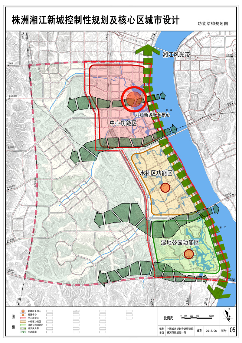 规划形成“一心两片,两带多廊”的城市空间结构。“一心”指湘江新城服务核心,依托沧水湖形成湘江新城的生态景观核心和公共服务中心;“两片”指宜居生活片和创新产业片;“两带”