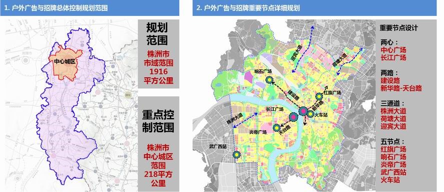 本次规划内容分两个层面,以株洲市中心城区218平方公里范围为本次总体控制规划范围;确定具有代表性的“两心、两路、三通道、五节点”为重要节点设计。