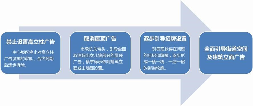 (1)大型落地式广告综合调整:逐步拆除城市建成区内的大型立柱式广告,以及快速路两侧大型立柱式广告;
