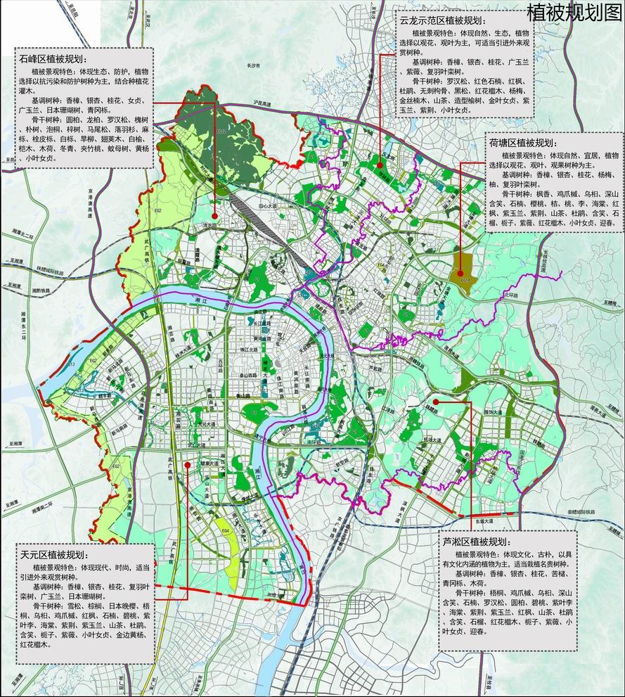 基于研究主城区自然植被的基础上,依据各树种的生态学特性,选择能维护城市生态平衡、改善城市环境、满足城市园林绿化多功能要求,反映城市特色的树种作为城市骨干树种和基调树种,从而构成株洲市特有的城市绿化景观风貌。