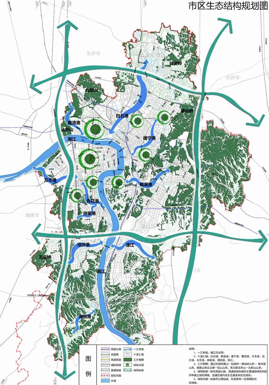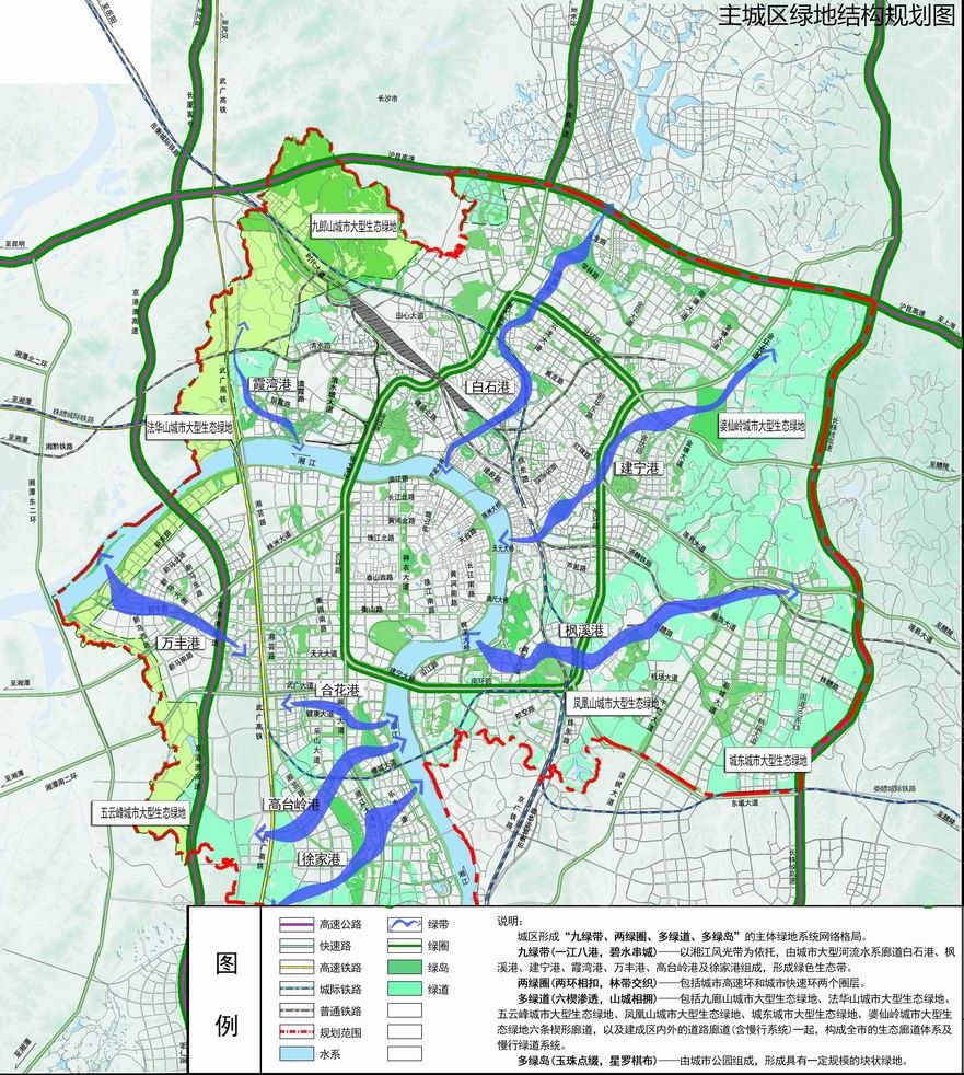 九绿带——以湘江风光带为依托,由城市大型河流水系廊道白石港、枫溪港、建宁港、霞湾港、万丰港、合花港、高台岭港、徐家港组成,形成绿色生态带,并通过划定河流水系廊道的蓝线和绿线进行控制保护。