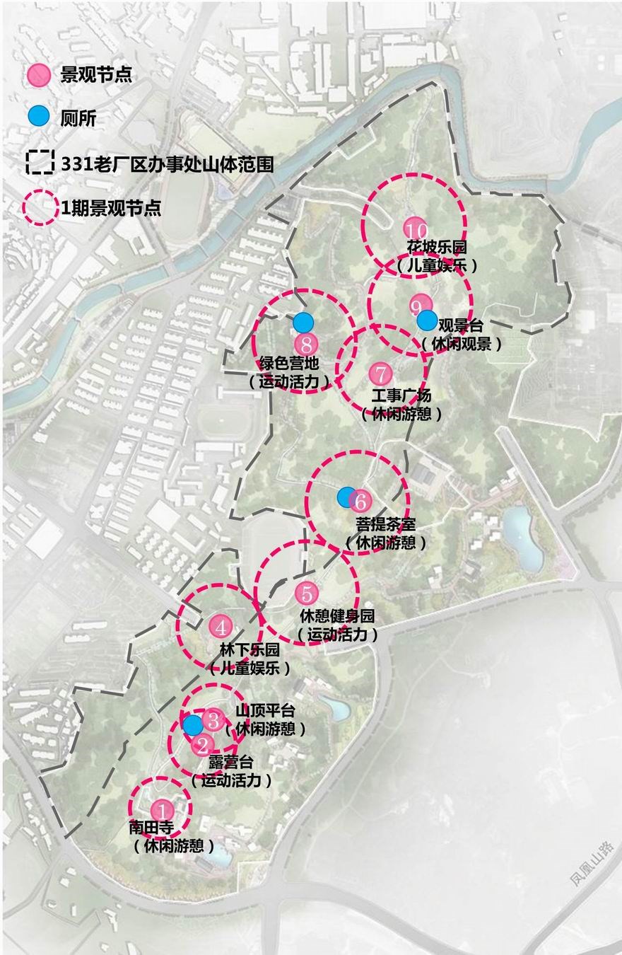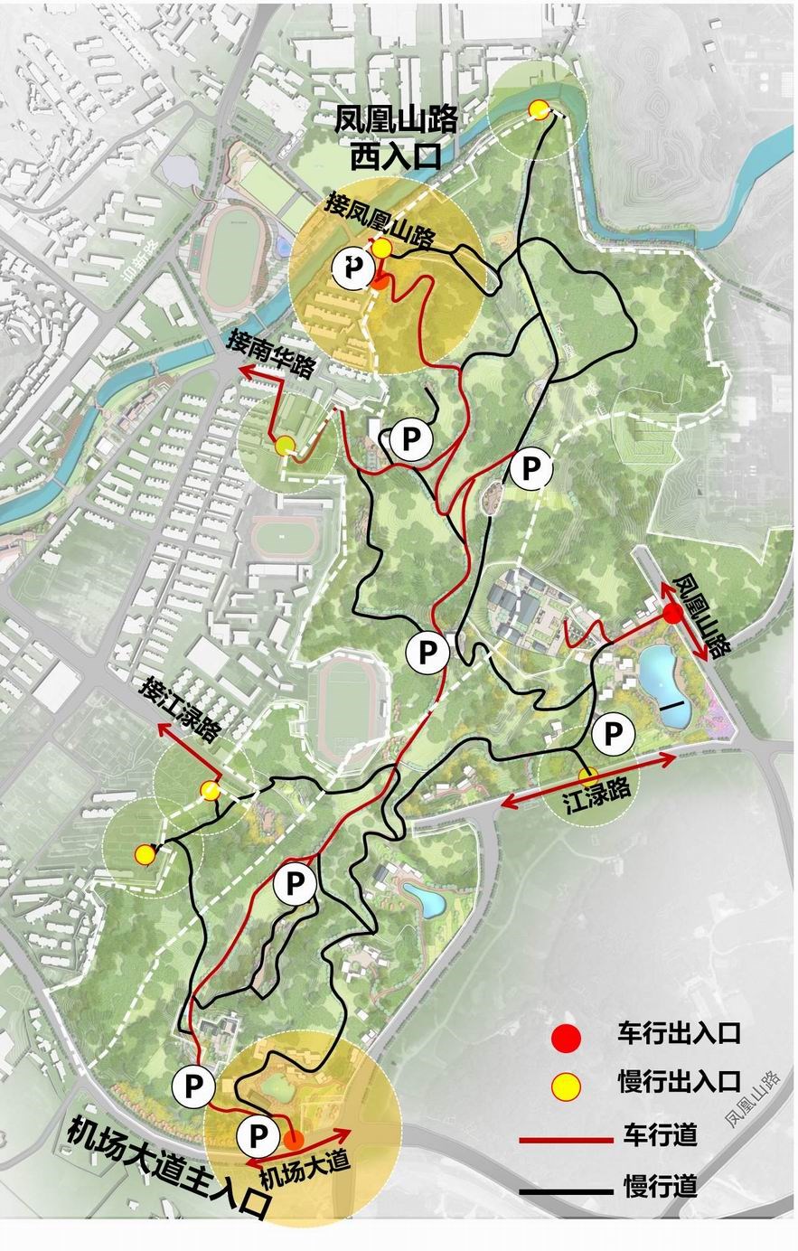 规划将凤凰山公园打造成为市级综合性城市公园,公园总面积为83.49公顷。依托凤凰山生态景观资源特色以及场地地形优势,结合游步道体系建设,观景和休闲平台打造以及相应的入口形象区建设,为市民休闲、健康运动、城市观景提供常态化的互动场所。