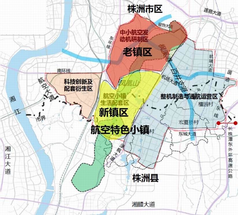 株洲航空特色小镇新老镇区差异化错位发展,老镇区以两机研发制造及产业配套社区为主导功能,打造融合复兴型航天智造小镇。 老镇区规划居住人口约为7.2万人。新镇区以通航产业、创意产业、综合服务及非航产业为主导功能,打造通航创意文化体验智造小镇。新镇区规划居住人口约为12万人。