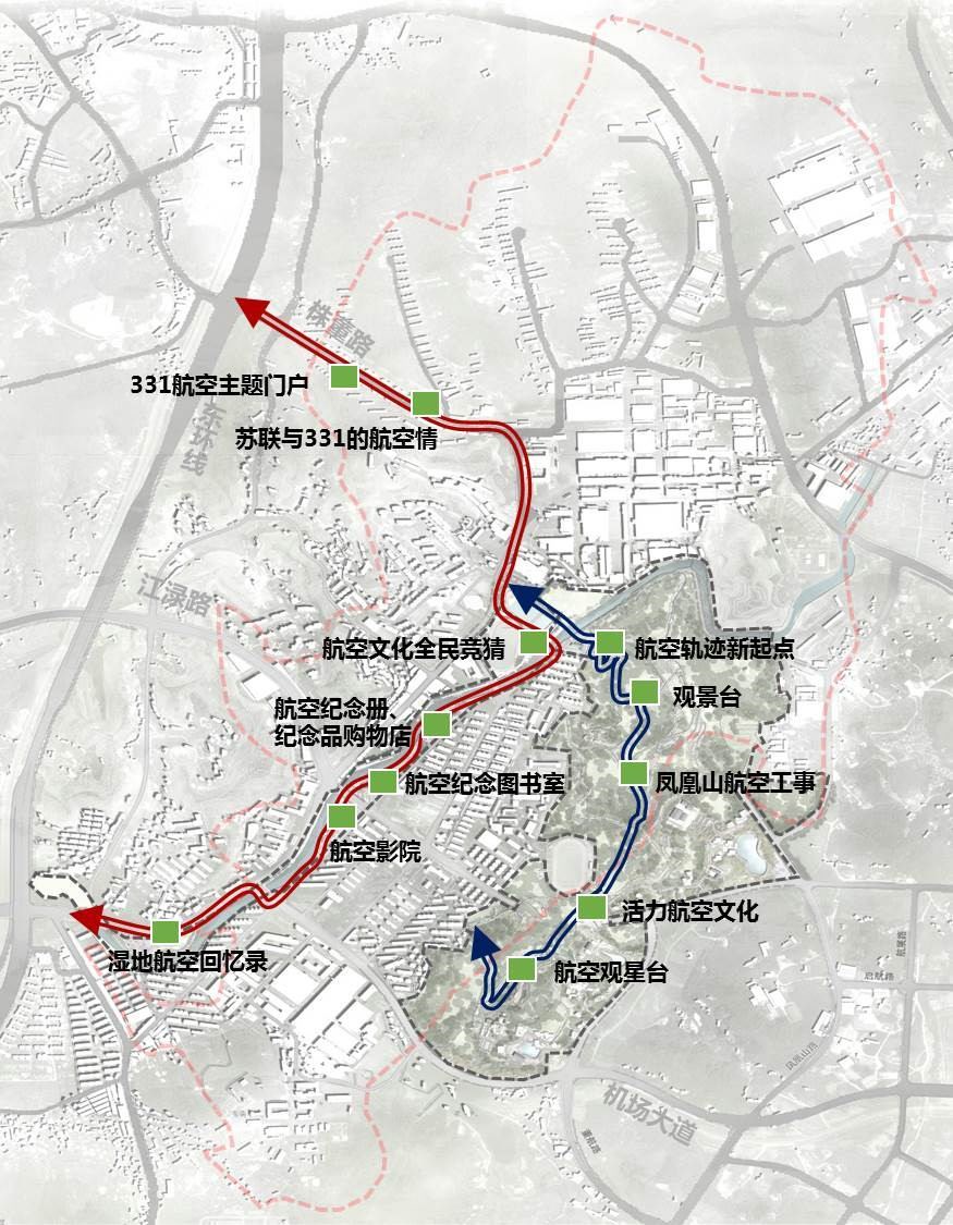 生态景观方面显山露水,通过凤凰山公园建设工程、枫溪港风光带提质工程,打造山水人文互融城镇格局。风貌重塑方面在规划区重要节点植入航空主题创意小品,明确城市家具主题,在休憩空间感受航空文化元素。