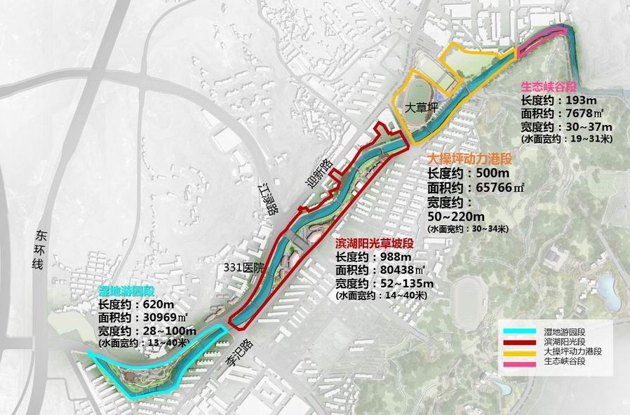 提质工程范围内枫溪港全长约2.3公里,总用地面积约19.6公顷,水面宽约13~40米。规划形成“一环四段”的景观结构,“一环”指串联沿港慢行游步道打造滨水生态走廊,“四段”分别指湿地游园段、滨湖阳光草坡段、大操坪动力港段、生态峡谷段。梳理枫溪港两侧现状空间和驳岸形式,塑造不同驳岸景观,丰富滨水空间界面,打造活力滨水生态走廊。同时结合两岸服务型设施和活力型商业布局规划, 打造枫溪港风光带休闲游憩带。