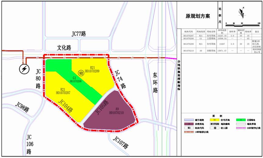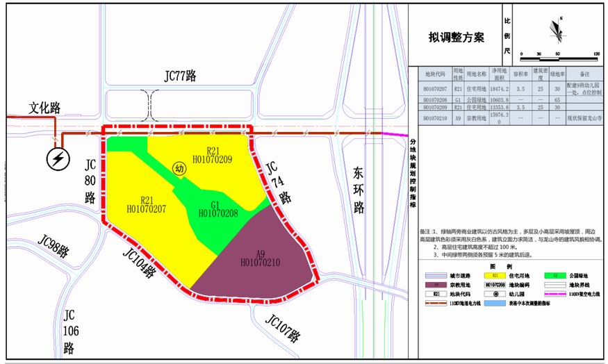(1)考虑到该项目的重要性,保证项目实施的可行性和经济效益收支平衡,在原控制性详细规划的基础上对拟调整地块开发强度和道路进行调整,调整取消了范围内的JC105路,调整后地块容积率不大于3.5。