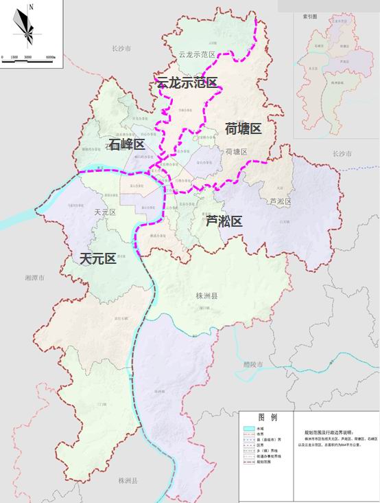 本次规划范围为株洲市区行政管辖范围,包含天元区、石峰区、芦淞区、荷塘区、云龙示范区,总面积约为862.5平方公里。