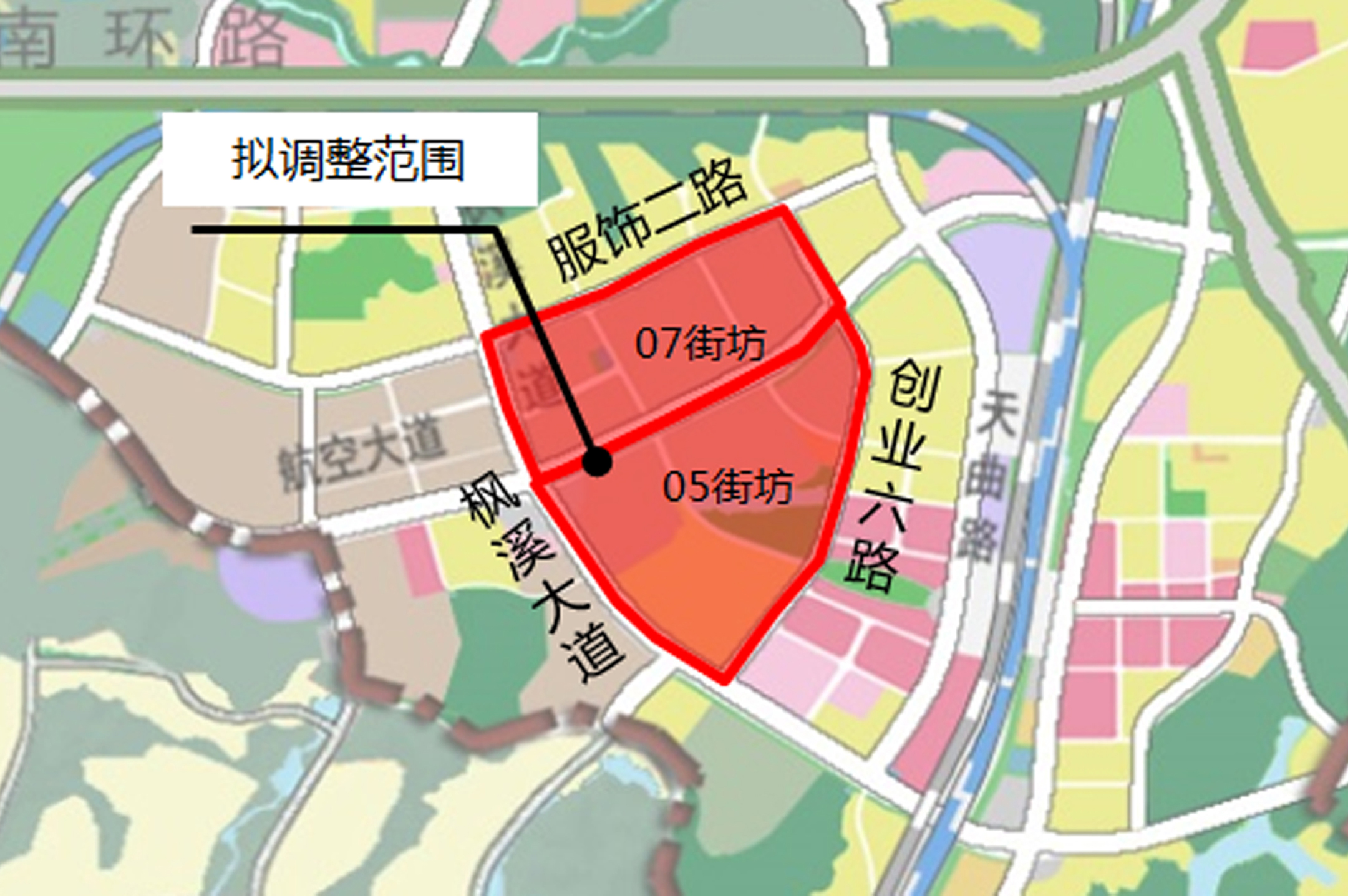 本次拟调整的范围为株洲市枫溪片区05单元07街坊和06单元05街坊,两街坊相邻,具体范围为枫溪大道、创业六路和服饰二路围合区域,05单元07街坊面积为42.75公顷,06单元05街坊面积为58.26公顷,总面积为101.01公顷。07坊现状西南面为工业用地,东北面为农林用地,有部分村民住宅;05街坊西面为工业用地,南面为蓝天花园住宅小区,东北面为山体,有部分村民住宅。