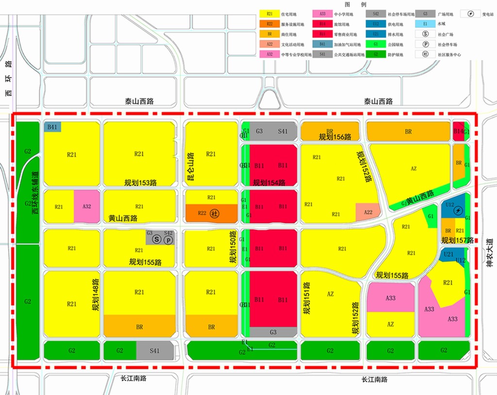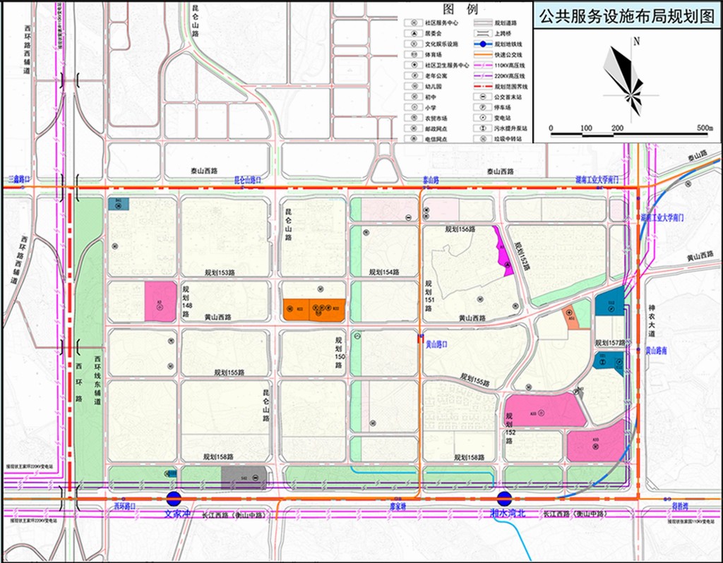 ② 加油加气站用地规划(B41) 规划保留现状西环加油站,位于泰山西路与西环线东辅道交叉口东南侧,面积为0.26公顷。 (4)道路与交通设施用地(S类) 规划城市道路用地43.11公顷和交通场站用地1.11公顷,其中交通场站用地包括一处独立公交首末站用地,位于衡山中路与昆仑山路西北侧,面积为1.07公顷;一处公共停车场,位于规划155路与规划152路交叉口东侧,面积为0.04公顷。 (5)公用设施用地(U类) 规划两处供电用地,其中一处为220KV河西变电站,位于黄山西路与神农大道交叉口西南侧,用地面积为0.75公顷;另一处位于规划157路南侧污水提升泵站的南侧,用地面积为0.13公顷; 规划新增一处垃圾中转站,位于规划158路与规划148路交叉口西南侧,用地面积为0.06公顷; 规划保留现状污水提升泵站,位于规划155路与规划157路交叉口东南侧,用地面积为0.41公顷。 (6)绿地与广场用地(G类) 规划绿地与广场用地面积为22.18公顷其中: 规划公园绿地4.28公顷,包括黄山西路与规划155路交叉口西南侧的街头绿地、规划150路东侧以及神农大道以西的绿化带: 规划防护绿地17.90公顷,主要是西环线、衡山中路北侧防护绿地。 (7)非建设用地 规划区内非建设用地主要为水域,用地面积为0.17公顷。 5 景观风貌规划