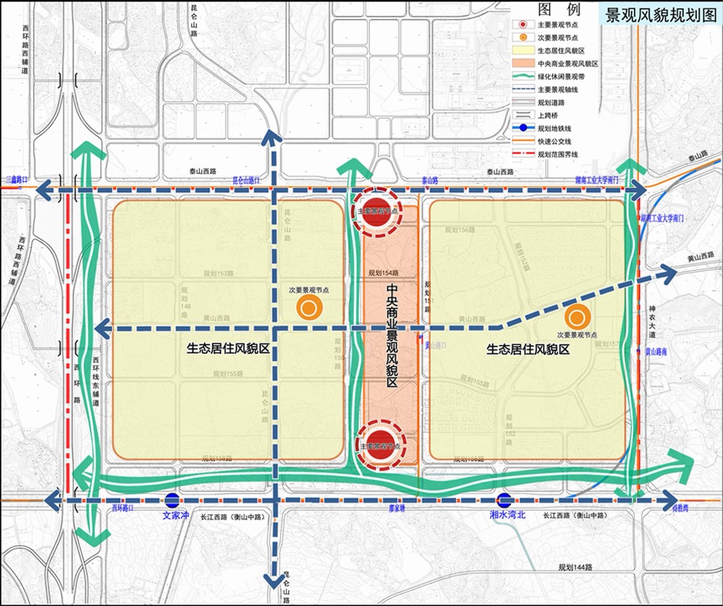 规划区形成“四轴、四带、三片区、多节点”的景观系统结构。 四轴:依托泰山西路、黄山西路、衡山中路和昆仑山路形成主要的城市景观轴。 四带:沿西环线绿地、衡山中路绿地、神农大道绿地以及五号地块绿地景观构成绿化休闲景观带。 三片区:包括西部生态居住风貌区、中部中央商业景观风貌区和东部生态居住风貌区。 多节点:以公共服务中心、街头绿地构成的景观节点,其中神农五号地块南北为主要景观节点,一个社区公共服务中心和一个街头绿地为次要景观节点。