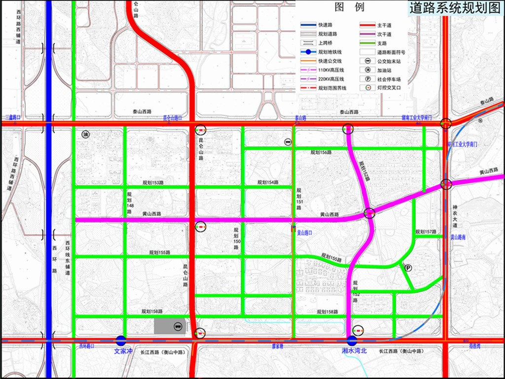 (1)道路系统规划 本次规划调整昆仑山路为城市主干道。 规划形成 “三横四纵”的路网结构: 三横:由泰山西路、黄山西路、衡山中路组成的横向路网。泰山西路和衡山中路是规划区主要的对外主干道,承担规划区与城市中心区主要联系通道作用。黄山西路为城市内部次干道,连接规划区内外交通联系。 四纵:为西环路、昆仑山路、神农大道、规划152路组成的纵向路网。其中西环路是联系株洲其他城区的重要快速道路,昆仑山路、神农大道控制为南北联系的城市主干道,规划152路为联系规划区南北向交通的城市次干道。 (2)慢行道路系统