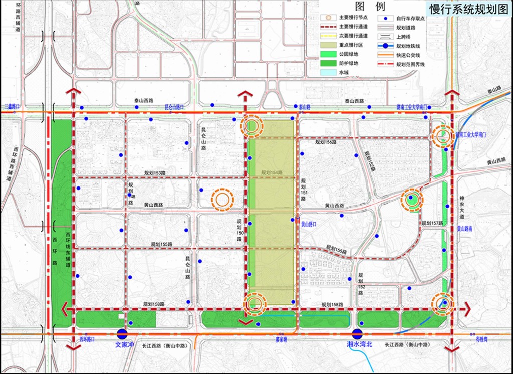 将人步行10分钟600-800米作为城市功能组团的舒适尺度,将自行车出行10分钟2500米作为城市片区的最大规模。基于片区的空间尺度特征,构造“慢行区域+慢行廊道”所组成的点、线、面相结合、有机串联的分级慢行交通系统。 ① 慢行通廊 慢行系统的通廊包括两个级别,分别为主要慢行通廊和次要慢行通廊。 主要慢行通廊依托规划区主要的景观性道路打造,规划区主要慢行通廊为神农大道、规划150路、规划158路和西环线东辅道。