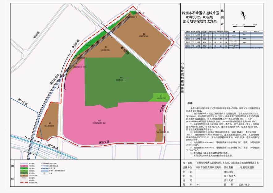 (4)中车大道以东,重桥西路以北根据试运线拟新征用地线以及现状已征地线将部分防护绿地(G2)修改为一类工业用地(M1),面积约为4856.55㎡,地块编码为S01030304-1,建设试运线及配套道路。