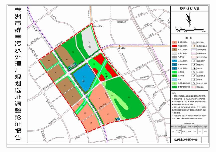 1)规划拟调整群丰污水处理厂至湘芸路与枫太路(G320南线)东南角地块内,用地面积16.02公顷。