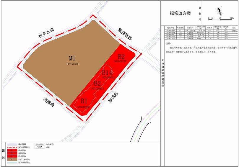本次拟将原S01030208地块一类工业用地(M1)划分为S01030208、S01030220、S01030221、S01030222、S01030223五个地块。S01030208地块用地性质仍为工业用地(M1),S01030220地块用地性质由原工业用地改为商务用地(B2),S01030221地块用地性质由原工业用地改为旅馆用地(B14),S01030222地块用地性质由原工业用地改为商务用地(B2),S01030223地块用地性质由原工业用地改为商业用地(B1)。