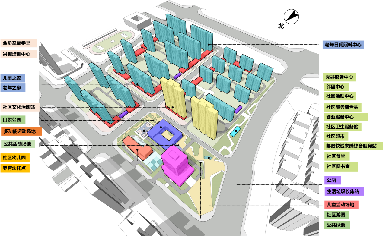 本案包含住宅用地3块,西北角服务设施用地配备幼儿园(6班)、社区综合服务中心、商业办公酒店、城市广场(结合公共停车场开发)、城市微公园等功能,补齐社区服务设施短板,全力改善人居环境,聚焦为民、便民、安民服务,致力于打造宜学宜居,安全健康、设施完善、管理有序的绿色完整居住社区。