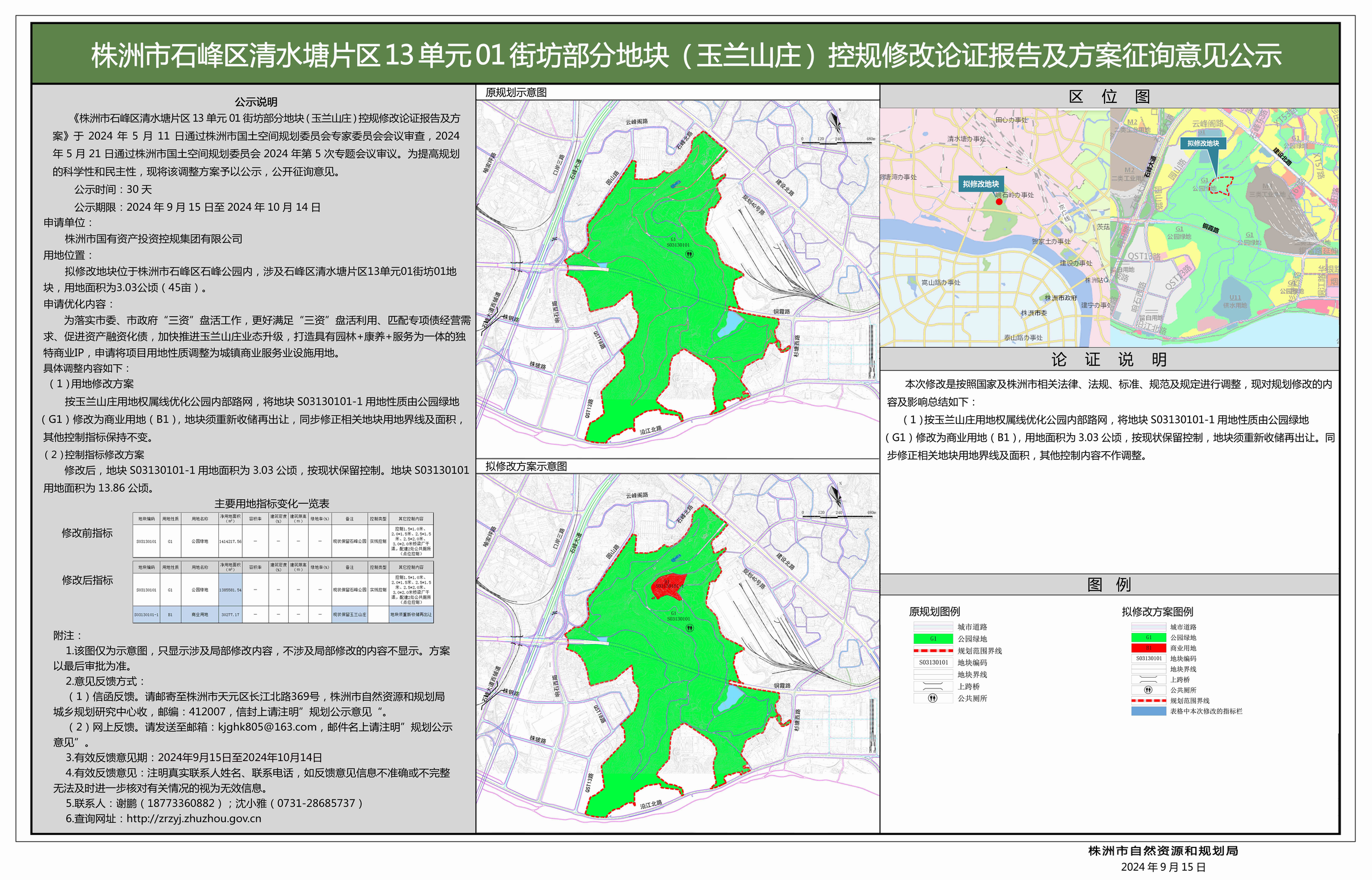 《株洲市石峰区清水塘片区13单元01街坊部分地块(玉兰山庄)控规修改论证报告及方案》征询意见公示