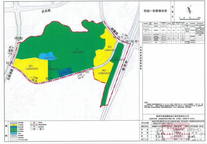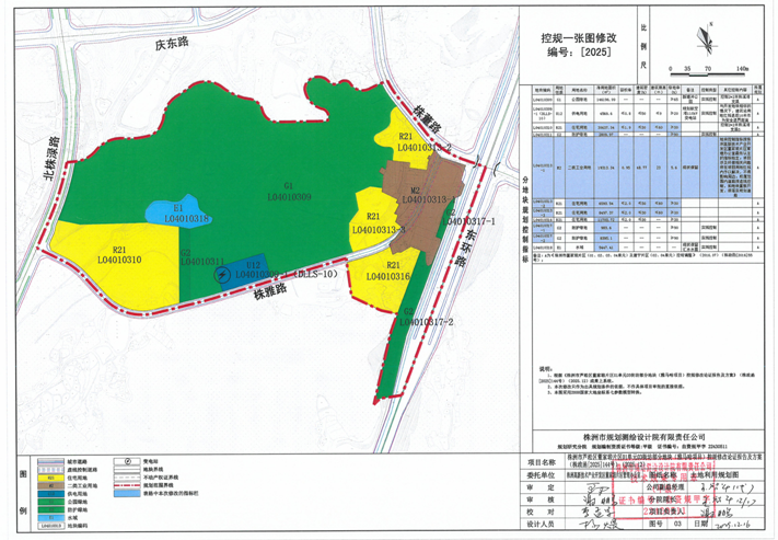6.公布内容:涉及雅马哈项目权属范围内道路按虚线控制,包括株雅路、株董路、东环路辅道部分段;如地块重新开发,须落实规划道路。同步修正道路竖向规划,未改变道路整体排水方向。根据不动产权证将地块L04010313-1恢复为工业用途,用地性质调整为二类工业用地(M2),用地面积为19313.34㎡,位于城镇开发边界外部分,待完成城镇开发边界调整后方可实施,容积率0.95,建筑密度48.77%,建筑限高23米,绿地率5.6%,现状保留。因修改占用了742.52㎡公园绿地,按照公园绿地占补平衡的原则,将地块L04010310北侧部分用地调整为公园绿地(G1),并入地块L04010309,修改后地块L04010309用地面积为146196.99㎡。同步修正相关地块用地界线及面积,其他控制内容均不作调整。备注:“地块控制指标按株洲高新技术产业开发区董家塅片区管理办公室最终认定的指标给定;项目涉及环保相关问题须在项目用地红线内予以解决,不得影响周边;权属范围内道路按虚线控制,如地块重新开发,须落实规划道路。”