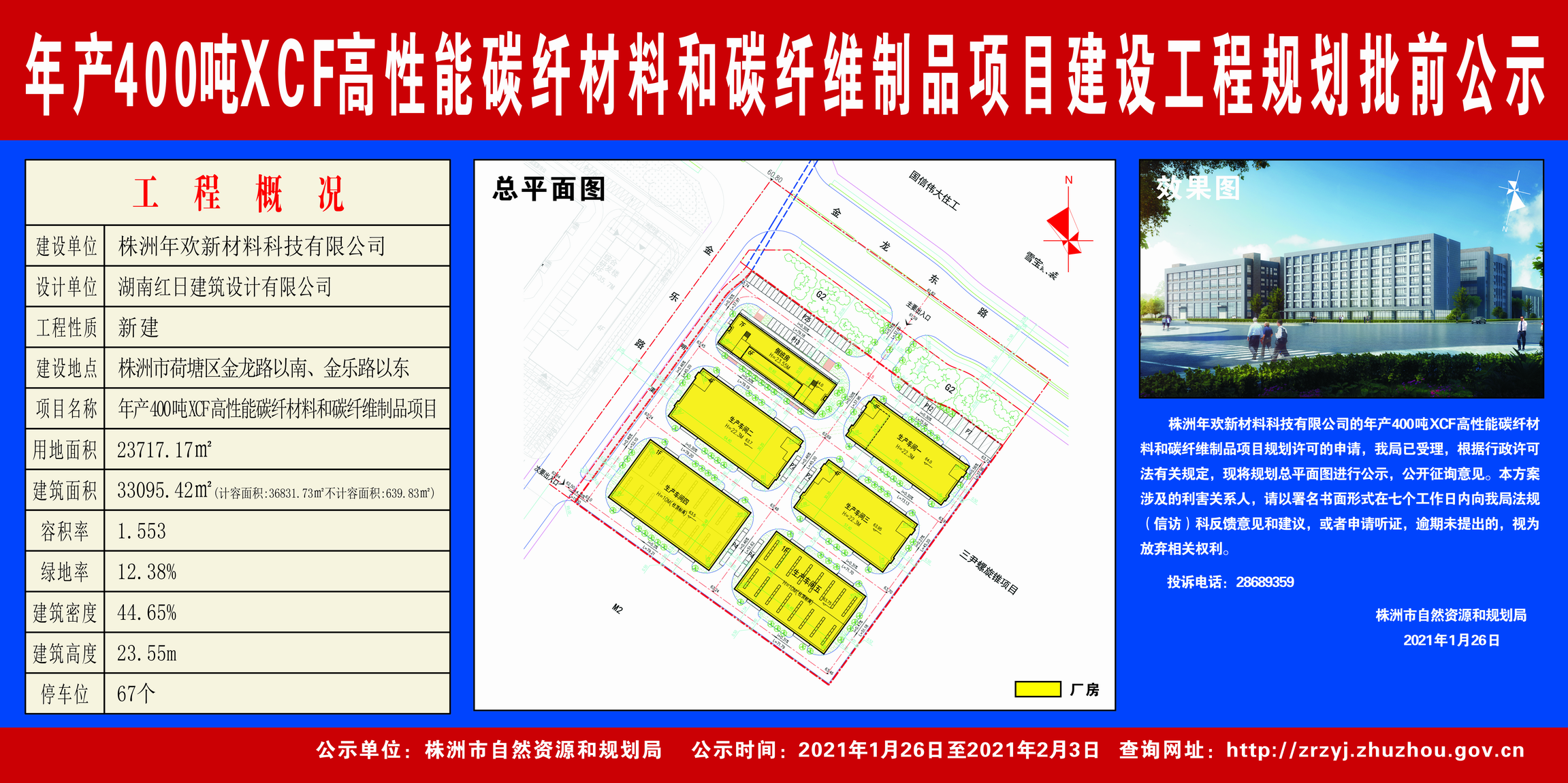 株洲年欢新材料科技有限公司(年产400吨XCF高性能碳纤材料和碳纤维制品项目建设工程规划批前公示)2
