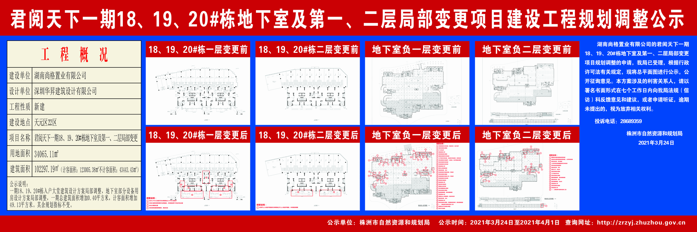 湖南尚格置业有限公司(君阅天下一期18、19、20#栋地下室及第一、二层局部变更项目建设工程规划调整公示)2