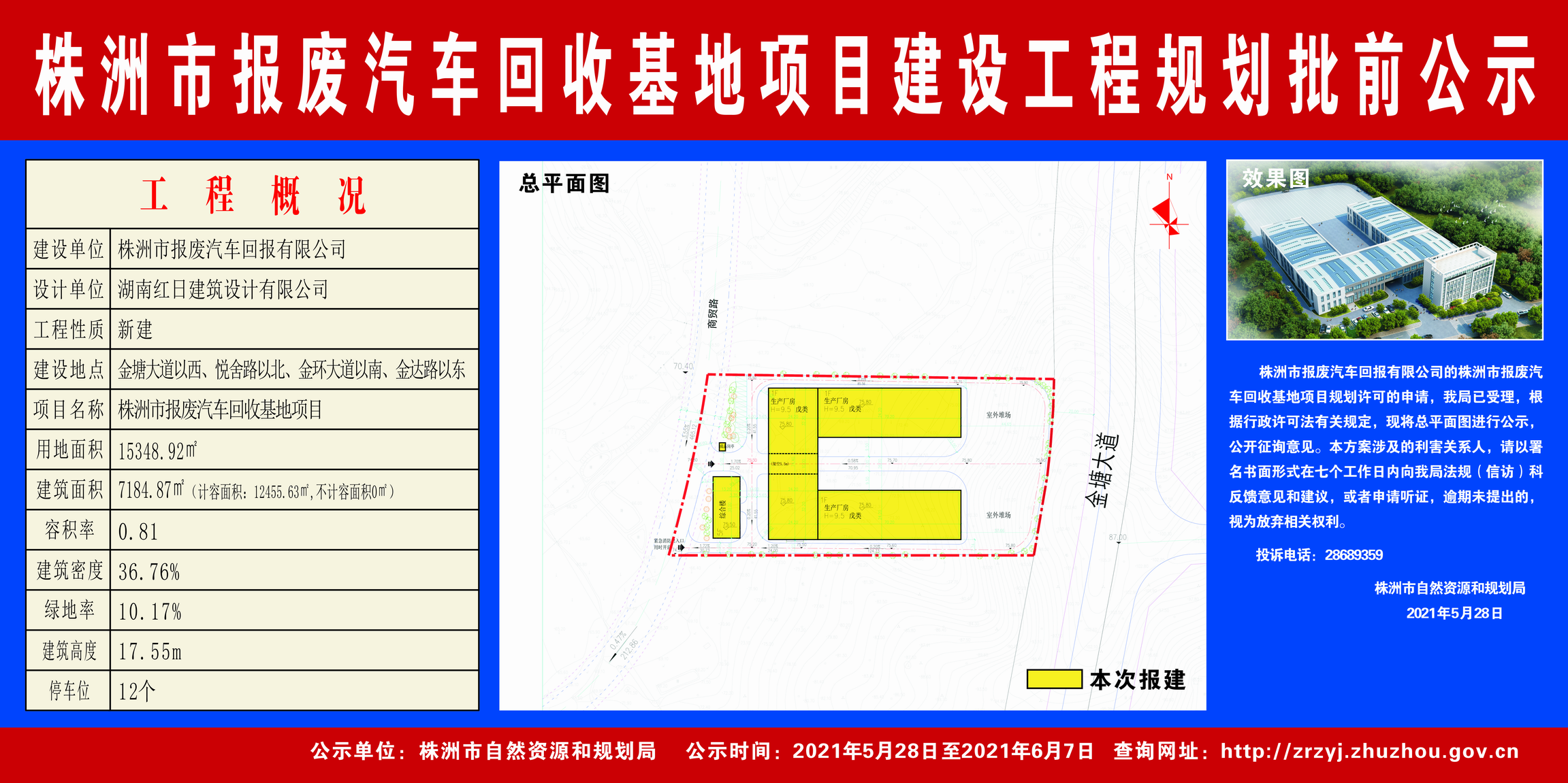 株洲市报废汽车回报有限公司(株洲市报废汽车回收基地项目建设工程规划批前公示)2