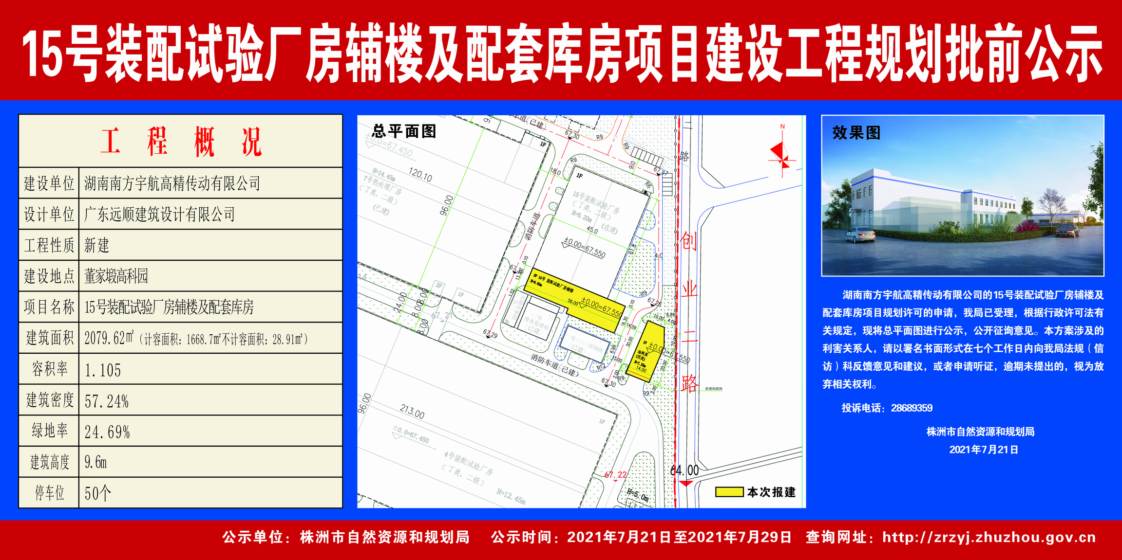 湖南南方宇航高精传动有限公司(15号装配试验厂房辅楼及配套库房项目建设工程规划批前公示)2