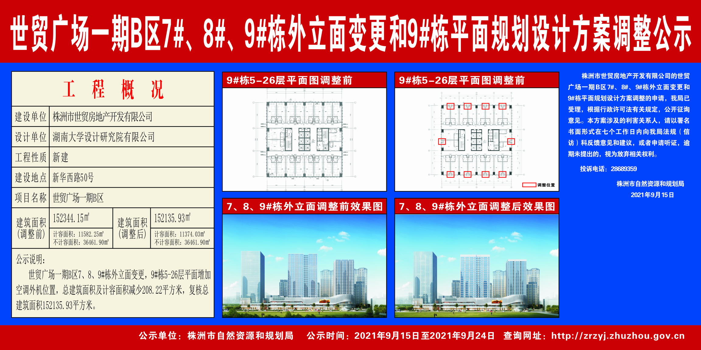 株洲市世贸房地产开发有限公司(世贸广场一期B区7#、8#、9#栋外立面变更和9#栋平面规划设计方案调整公示)2