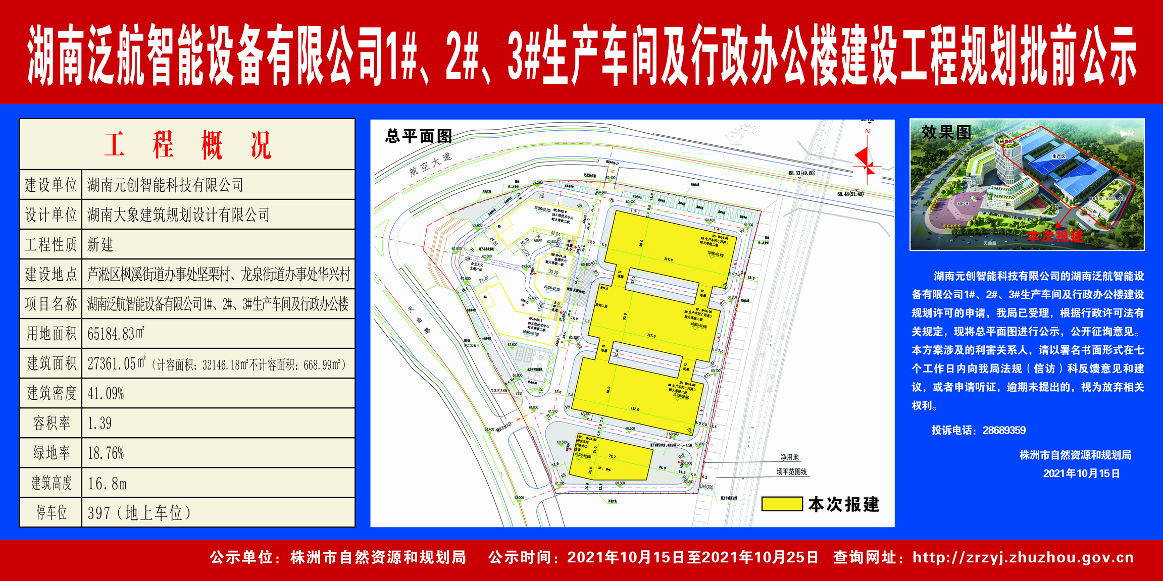 湖南元创智能科技有限公司(湖南泛航智能设备有限公司1#、2#、3#生产车间及行政办公楼建设工程规划批前公示)2