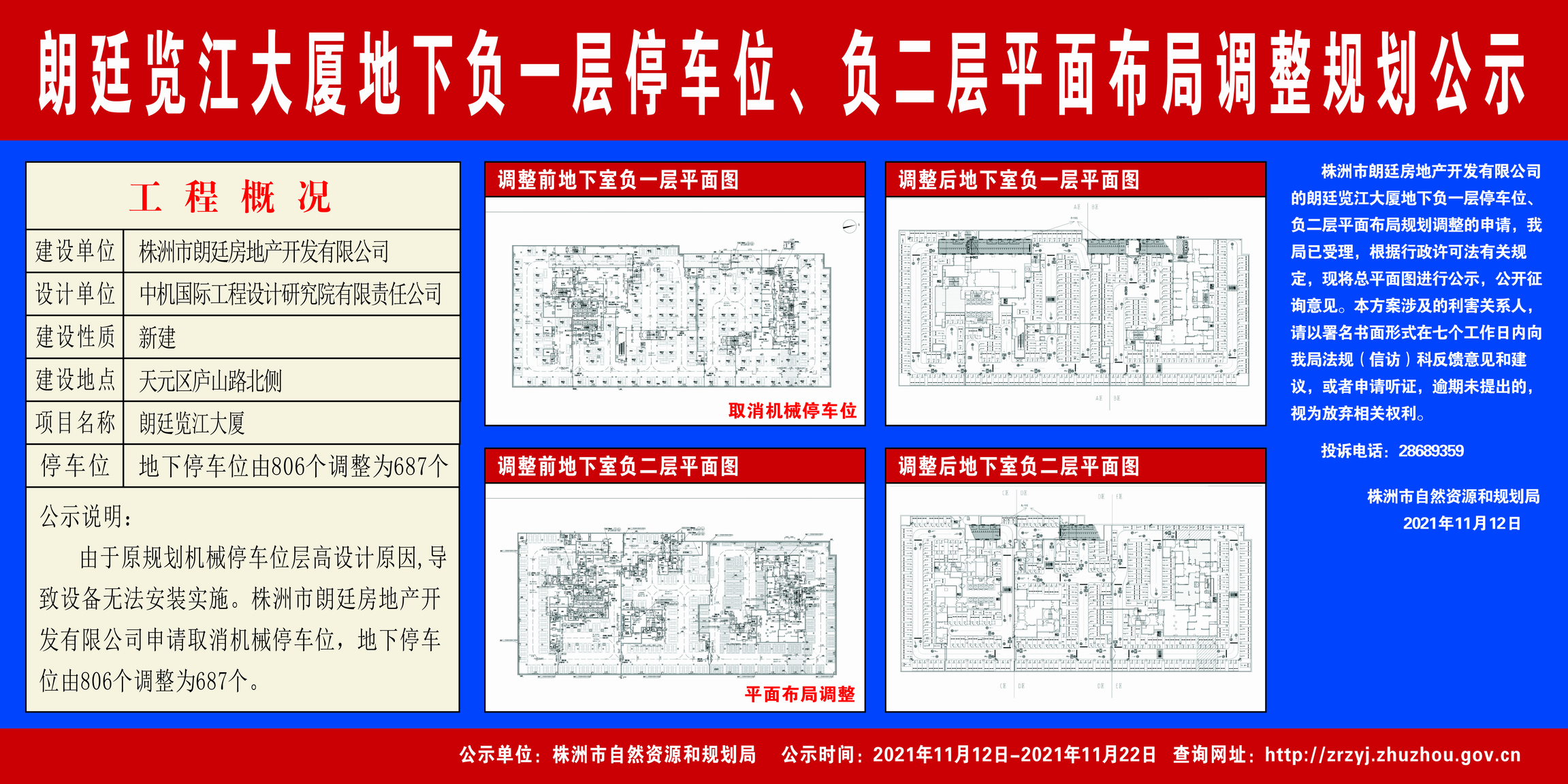 株洲市朗廷房地产开发有限公司(朗廷览江大厦地下负一层停车位、负二层平面布局调整规划公示)2