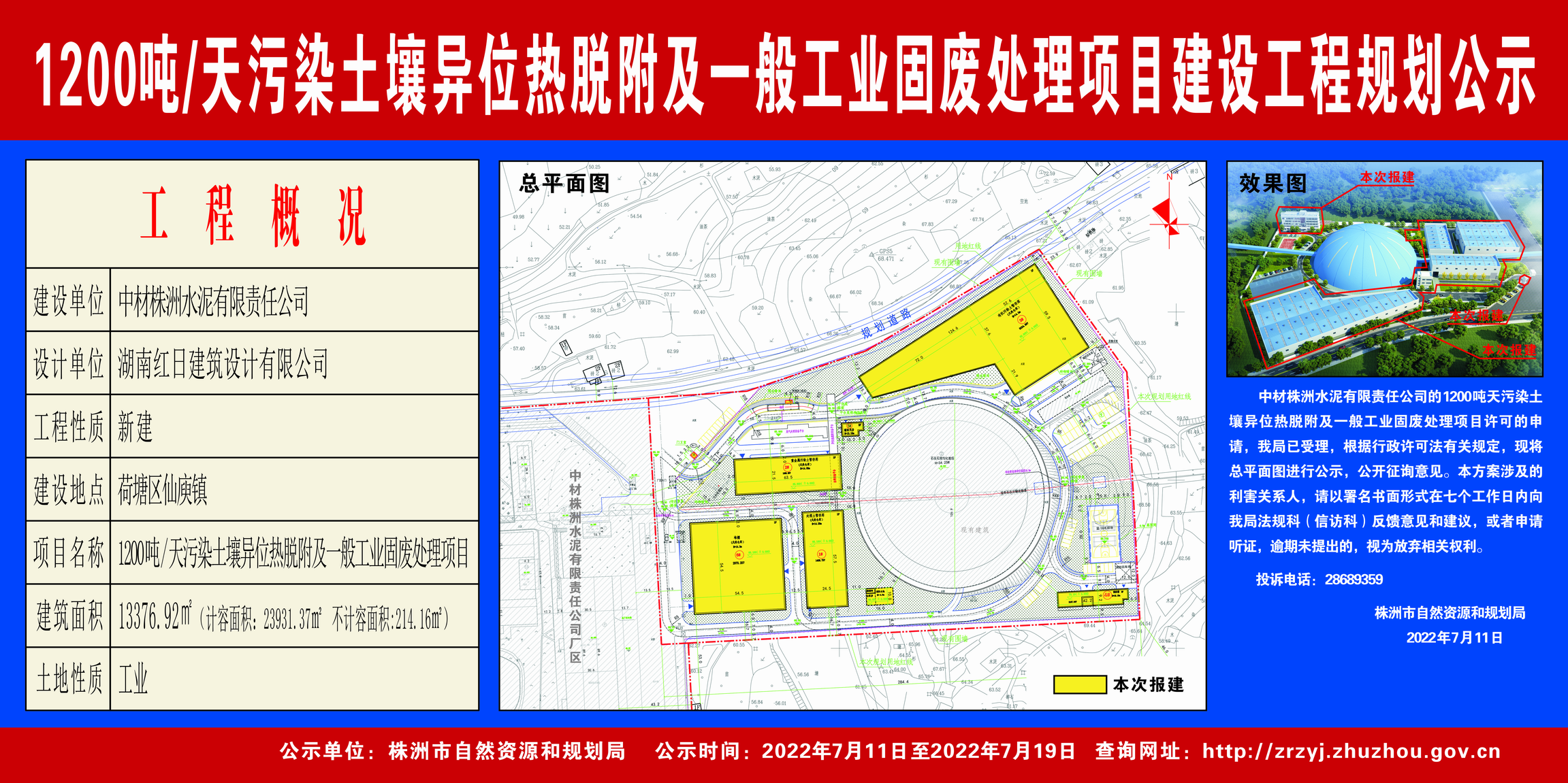 中材株洲水泥有限责任公司(1200吨天污染土壤异位热脱附及一般工业固废处理项目建设工程规划公示)2