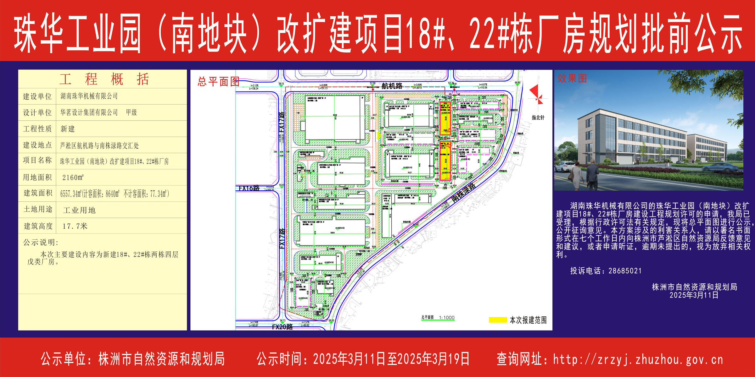 珠华工业园(南地块)改扩建项目18#、22#栋厂房规划批前公示