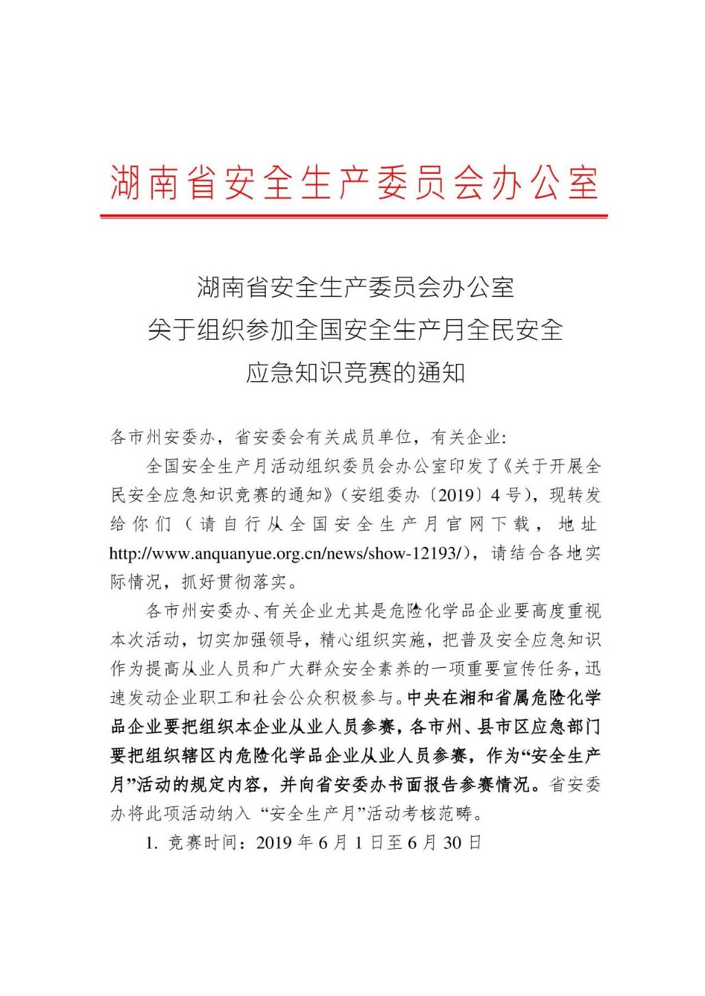 湖南省安全生产委员会办公室关于组织参加全国安全生产月全民安全应急知识竞赛的通知