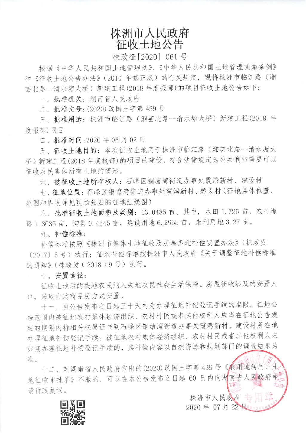 征收土地公告--株洲市临江路(湘芸北路--清水塘大桥)