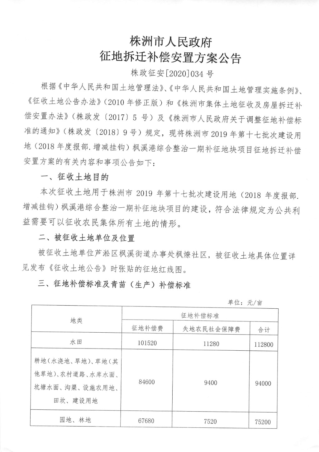 征地拆迁补偿安置方案公告--枫溪港综合整治一期补征地块
