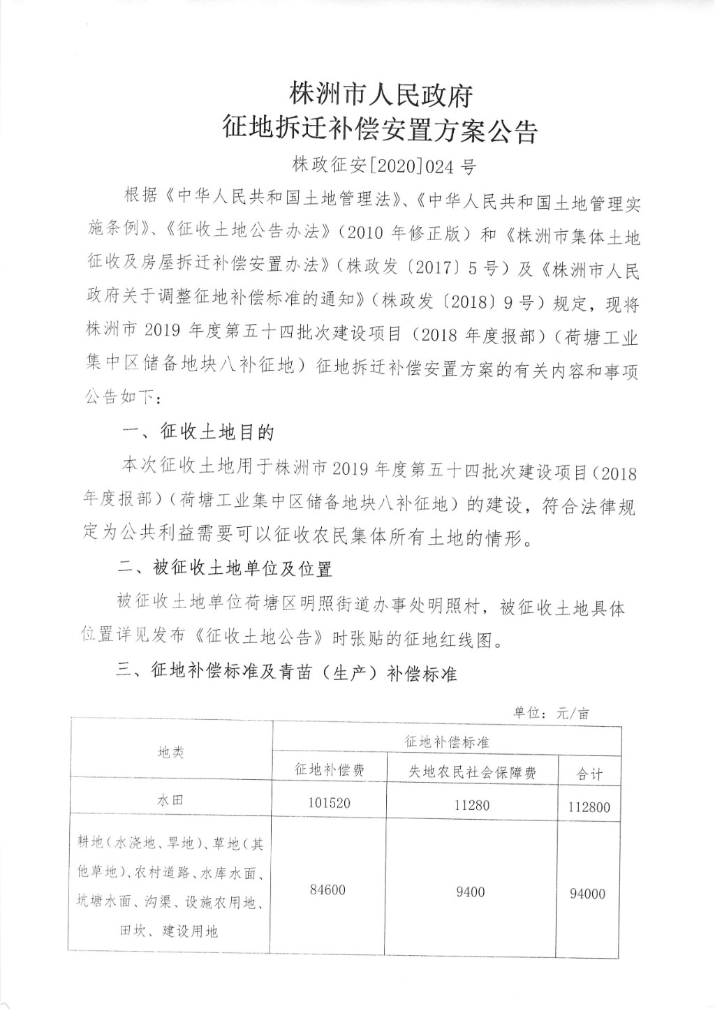 征地拆迁补偿安置方案公告--荷塘工业集中区储备地块八补征地