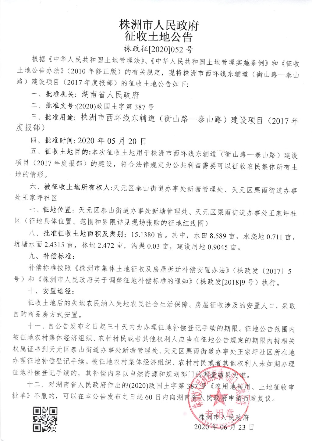 征收土地公告--株洲市西环线东辅道(衡山路--泰山路)