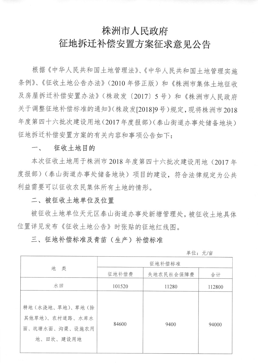 征地拆迁补偿安置方案征求意见公告--泰山街道办事处储备地块