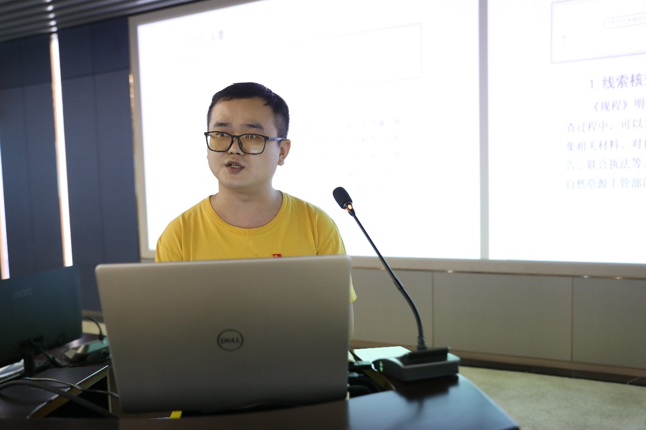 第一位主讲人是来自行政执法支队的覃琅,他以"自然资源违法行为立案查处工作流程重点解读"为题,通过相关政策出台背景、立案查处流程和重点问题三个维度,详细解读了党中央、国务院对于行政执法新要求的重点、流程和难点问题,并对自然资源部印发的《自然资源违法行为立案查处工作规程(试行)》进行了重点介绍,从立案、取证、案情分析、报告起草、案件审理审核、处理决定、执行、结案归档等八个方面,全面解读立案查处工作的全过程。