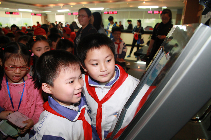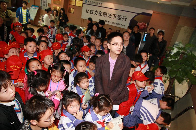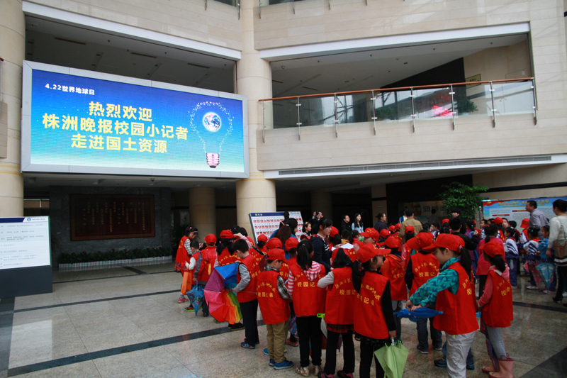 4月25日,第45个世界地球日,株洲日报社校园记者俱乐部百名小记者走进株洲国土资源,参观业务窗口,聆听专家讲授地球知识,现场触摸恐龙化石