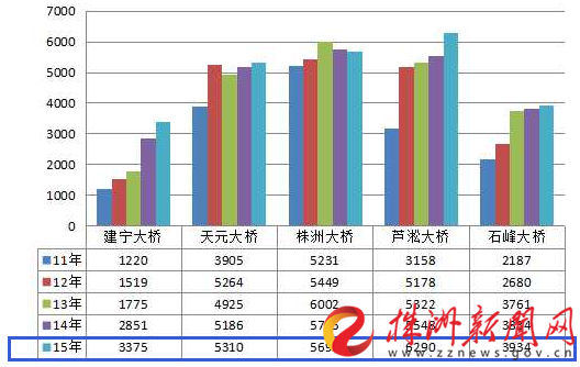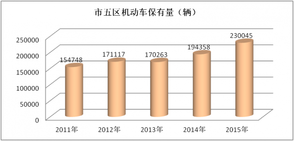 2011-2015年市五区机动车保有量发展图(图来源/株洲市规划局) 株洲市机动车保有量保持持续增长态势。《报告》显示,截至2015年底,市区常住人口为123万人,机动车保有量达23.0045万辆,比上年增长3.4984万辆,汽车保有量为19.5709万辆,比上年增长3.4984万辆。也就是说,去年市五区平均约每5个人拥有一辆机动车,平均约每6人拥有一台汽车。 芦淞大桥上的汽车流量最多