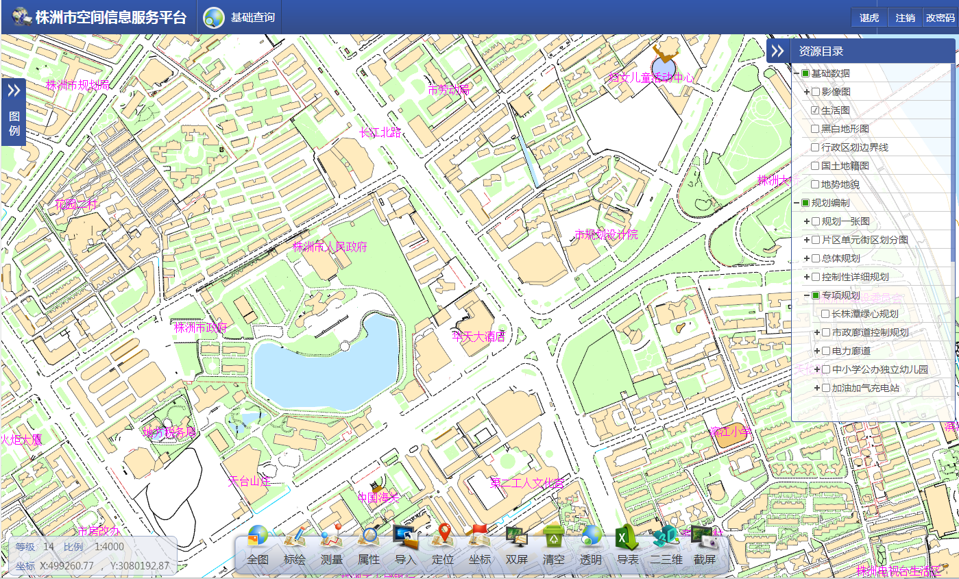 为贯彻落实《中华人民共和国测绘法》、《湖南省地理空间数据管理办法》和株洲市"三测合一"等相关文件的精神,对接国家大地2000坐标系,进一步提升规划一张图服务水平,2018年5月,市规划局启动了2000版空间信息平台的升级项目,并委托信息中心开展相关工作,信息中心接到任务后,立刻协调测绘分院对现有数据的类型、数据量、坐标转换技术参数等情况进行了摸底,并拟定了《株洲市规划基础数据2000国家大地坐标系坐标转换方案》,确定由测绘分院数据中心负责基础地理数据的坐标转换工作,信息中心负责规划编制整合图层、业务审批红蓝线、专题数据的坐标转换和平台功能升级工作。经过近五个月的努力,2018年11月7日,该平台实现了上线试运行。