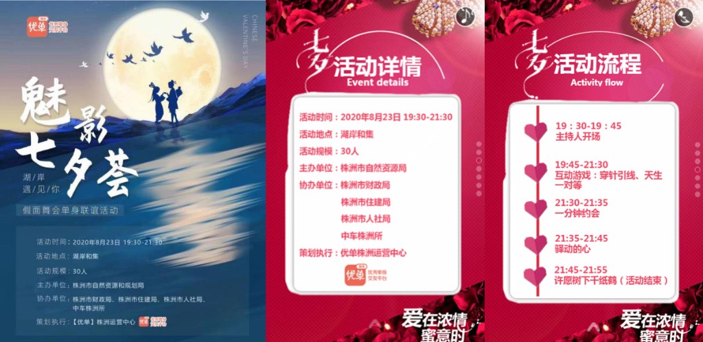 鹊桥相会,情定七夕,2020年8月23日,由市自然资源和规划局工会、市财政局工会、市住建局工会、市人社局工会和中车株洲所团委联合举办的“魅影七夕荟”主题派对在神农湖畔的湖岸和集举行。