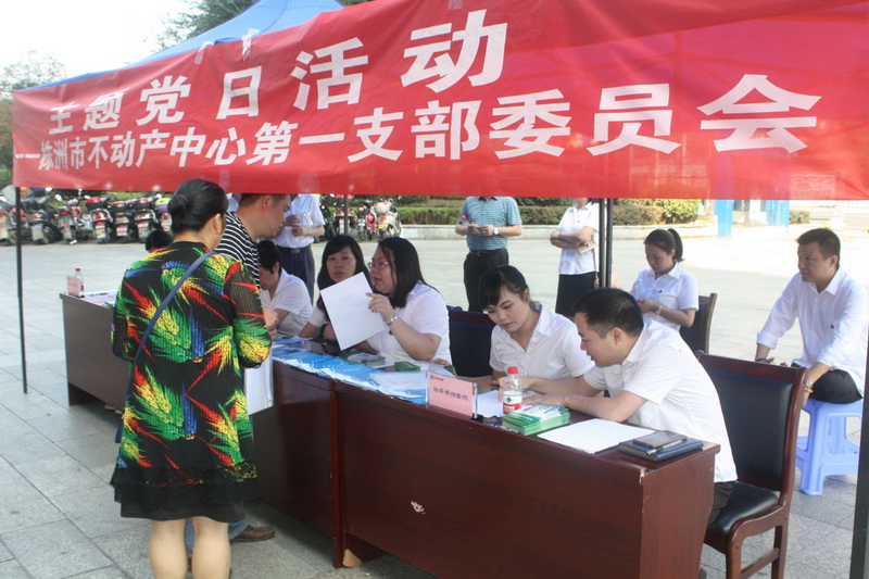 为使不动产登记政策深入人心,通过以“党建+业务”主题党日活动为载体,9月8日上午,株洲市不动产登记中心主任李武、支部书记秦秋波带领第一支部全体党员,在市中心人流量集中的家润多广场坪开展了“不动产相关知识现场咨询会” 的活动。