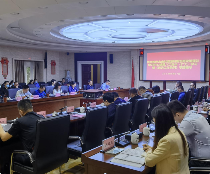 5月27日,中共株洲市自然资源和规划局党组理论学习中心组(扩大)2022年第八次集中学习暨《信访工作条例》专题辅导会在局二楼党组会议室召开。围绕“深入学习领会习近平法治思想和习近平总书记关于全过程人民民主的重要论述”的主题,会议特别邀请株洲市信访局党组成员、副局长江永宁同志作专题辅导授课,十三届市委第一轮巡察意识形态专项检查组副组长周穆庚、成员尹姮列席指导,党组成员、副局长言罗根主持并作学习总结。