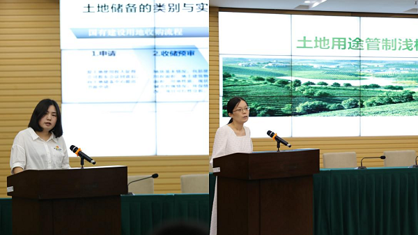 本期青年业务说结合第32个全国土地日"节约集约用地、严守耕地红线"的主题,由杨萍、谭美两位在基层一线工作的青年干部主讲土地用途管制和土地储备管理业务知识。二人运用实际工作中的鲜活案例,紧密结合相关法律法规政策,用"接地气"的表达方式讲解了自己工作领域的实践体会,参与听课的干部深受启迪。